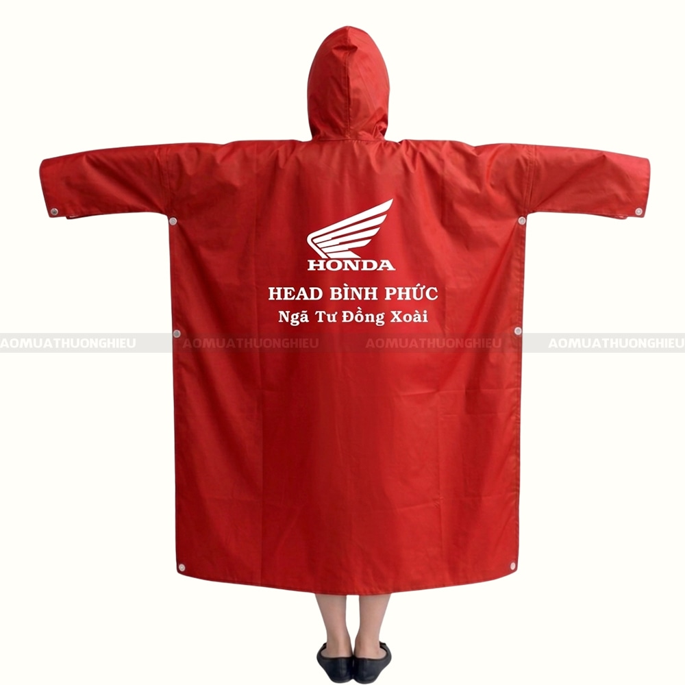 Sức hút lớn nhất nằm ở kỹ thuật in lụa sắc nét, giúp logo “Honda Head Bình Phước” hiện lên đầy uy tín trên nền đỏ rực rỡ. Đây chính là giải pháp “marketing di động” thông minh, giúp hình ảnh doanh nghiệp len lỏi qua từng con phố một cách tự nhiên và bền bỉ nhất. Một món quà tặng thiết thực như thế này chắc chắn sẽ chiếm trọn cảm tình và lòng tin của khách hàng. Đừng để những cơn mưa làm gián đoạn kết nối của bạn với khách hàng. Hãy liên hệ ngay với chúng tôi để đặt áo mưa in logo theo yêu cầu, cam kết chất lượng bền đẹp, tiến độ nhanh chóng và giá thành tối ưu nhất thị trường!